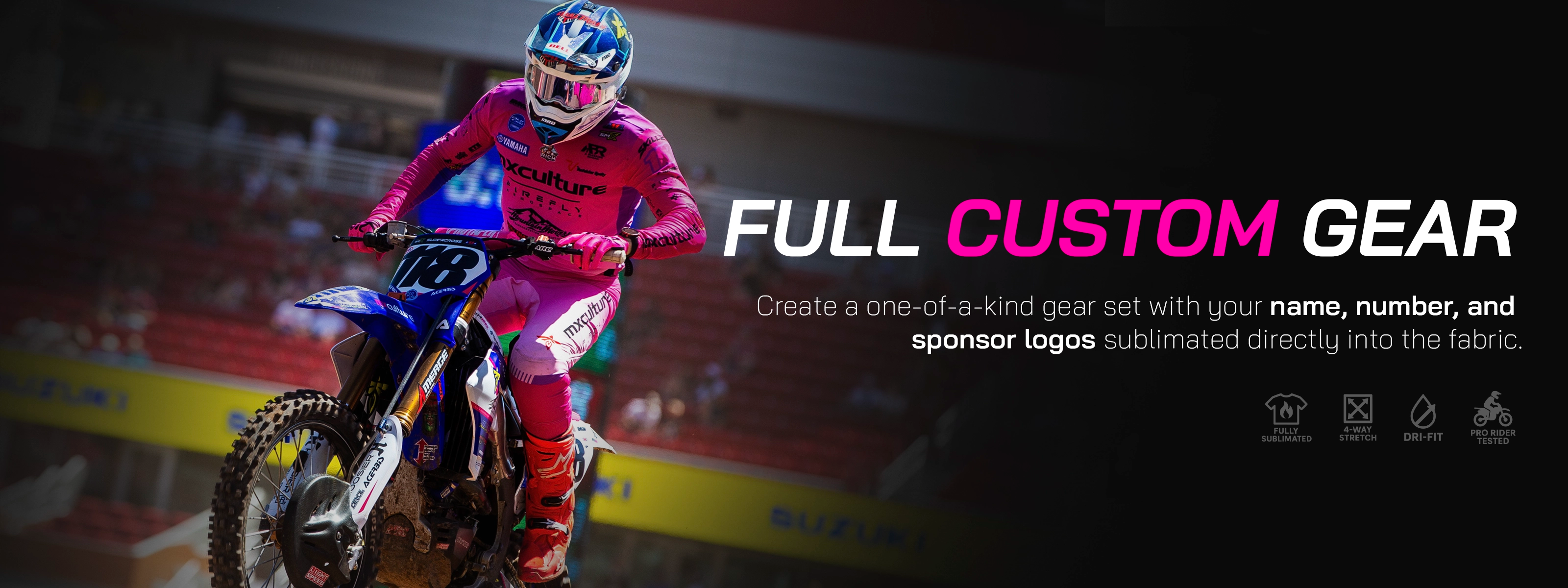 Custom Motocross Gear with FREE Sublimated Logos, Names & Numbers on every jersey and pants. No two kits are the same.